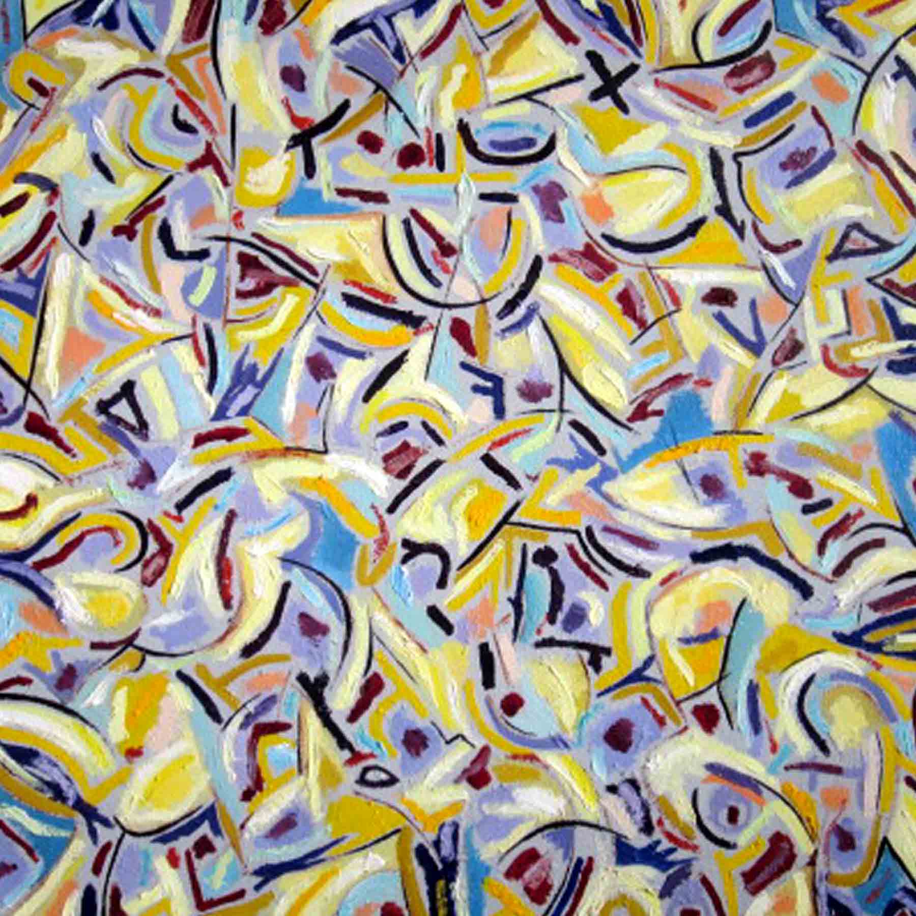 Daphne’s late works, especially those from 2012 onwards, showed a return in terms of their construction to the themes of puzzles and implied connections that she explored in the past. The pared down approach to the canvas displays the almost mathematical precision with which Daphne went about the task of developing each work, a study in colour and balance.