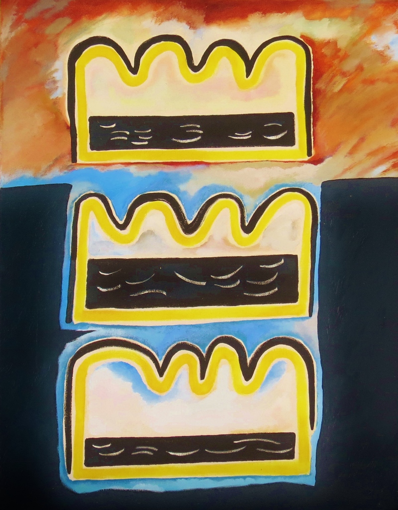 The first of the Expatriate series paintings was painted some years prior to the move to England. Although vibrant, it carries a kind of tension in the midst of celebration, compared to the works that would come later. The imagery is somewhat akin, though not deliberately, to the layout of a pinball machine. There is a definite sense with this painting of movement and restraints, the bouncing of ideas and impulses back and forth, all linked to this pull from across the sea.