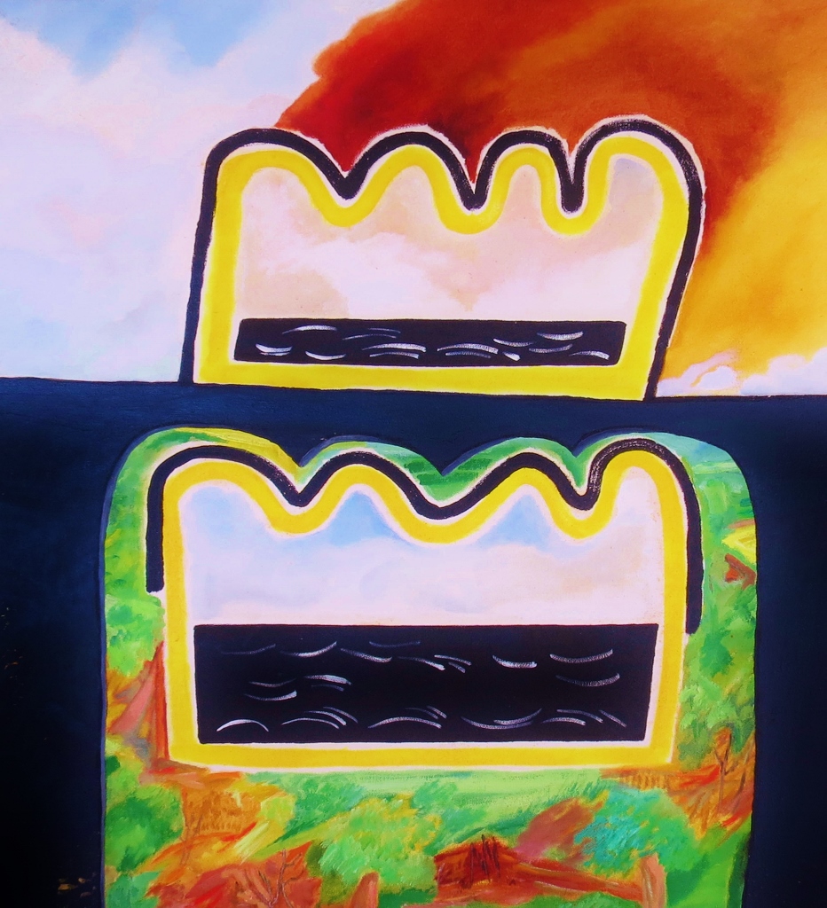 The remaining works in this series were in contrast inspired by extended periods spent in the UK, particularly in Cambridge. These were times of great contentment, carrying with them the chance to reflect on life on opposite sides of the globe. The still somewhat choppy seas have now settled within the joyous context of the meadow; a reference perhaps to the wildflowers and poppies that grew along the margins of the Cambridge fields each summer. The continuing use of the postcard from across the seas reminds the viewer of relationships that still sustain and need sustaining, despite the miles.