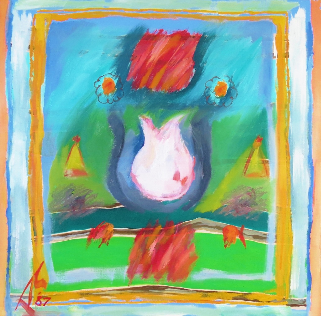 It is this ability to value the skill and originality of creative expression, regardless of medium or primary function, that surfaces here in Daphne’s aptly named Persian Carpet Series of 1987. The title is as telling as the design and creation of these paintings themselves. Although referencing a highly sought after form of artistic expression, the paintings owe as much to the Central Asian traditions of kilim weaving as do the more refined Persian carpets themselves.