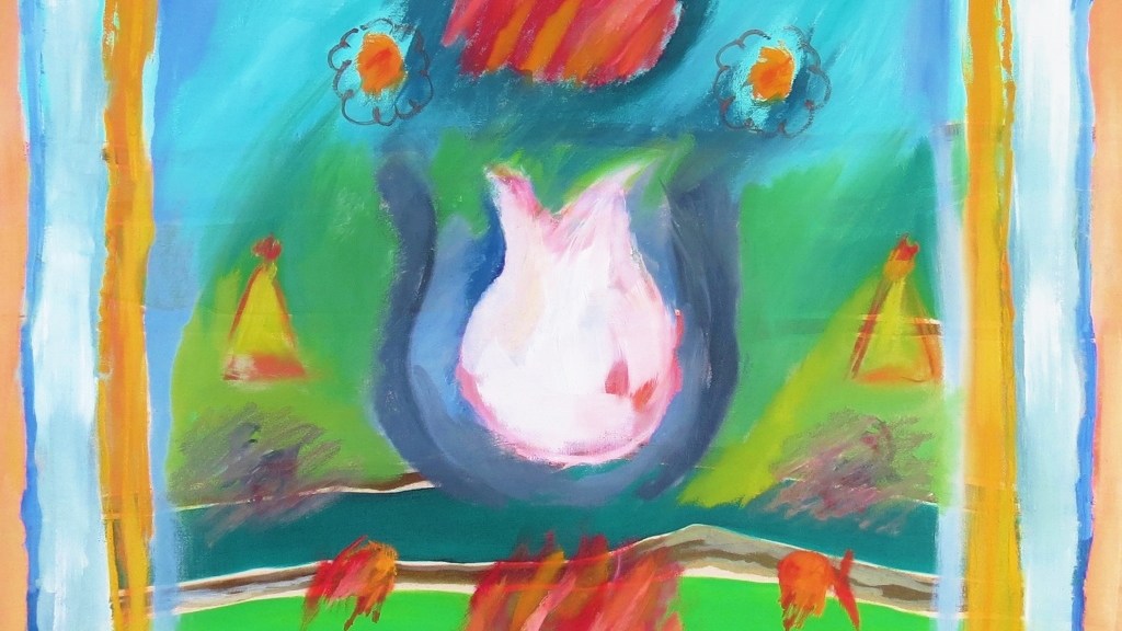 Traditional boteh (paisley designs, symbol of fruitfulness) burst out of a neatly ordered ribbon-like border, escaping in a riot of colour. Strange bow-like shapes are transformed into plants whose seeds seem to cover the earth. In most of the works stars, crosses, gul (traditional flower medallions), pomegranates or tulips, all add to the symmetry and balance; yet in this particular work they reinforce the sense that this is a wild and joyous celebration of escape from constraints.