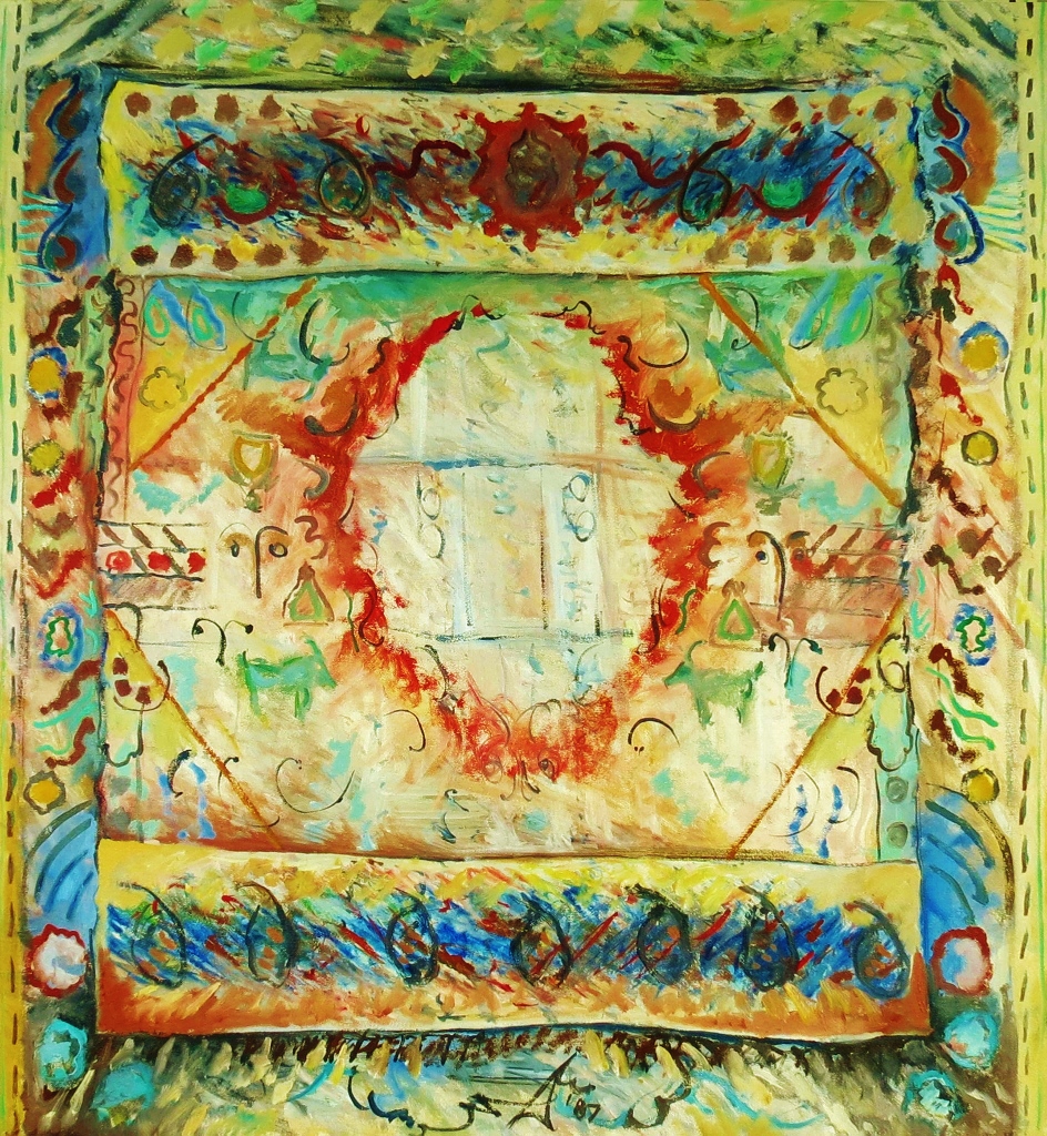 Persian Carpet No. 7 might be compared to a symphony, where the gul or medallion appears firmly embedded in the midst of the piece, like a recurring musical theme. Framed by “stitched” borders that firmly anchor the work’s many component parts, the painting has a weight and presence to it, like that of an orchestral work. Although the central gul is somewhat heraldic, any reference to lineage or legacy engages rather than distances the viewer, thanks to its overt or subliminally familiar imagery.